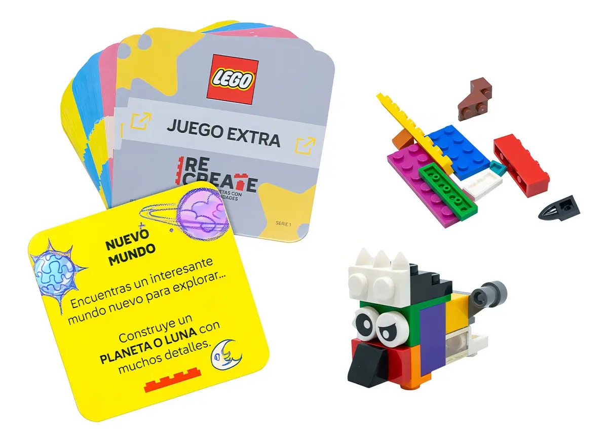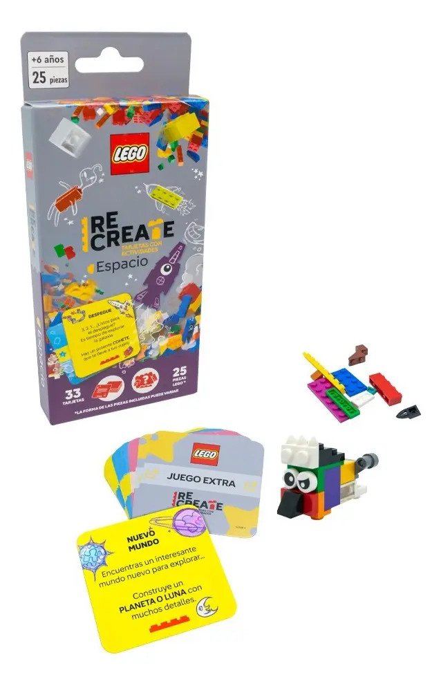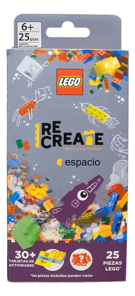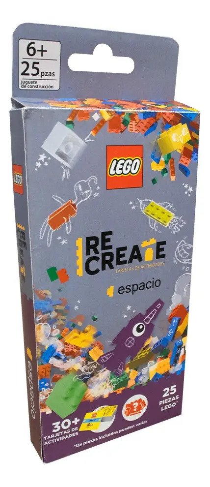 Viaja a las estrellas con LEGO Recreate Espacio. Construye naves, explora planetas y resuelve retos intergalácticos que te llevarán más allá. LEGO Recreate Crea, reta y construye momentos inolvidables. Incluye tarjetas de cuatro categorías Crea, Reto, Giro Nuevo y Juego Extra que potenciaran la imaginación y el aprendizaje.